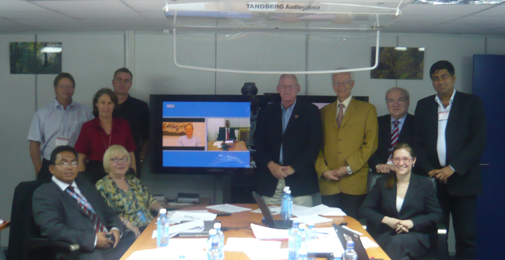 The Meeting of the GLTN International Advisory Board. From the left (seated) Danilo Antonio, UN-HABITAT Secretariat; Janice Peterson, Huairou Commission; and standing from the left Helge Onsrud, Statens Kartverk Norway; Clarissa Augustinus, Chief UN-HABITAT Land, Tenure and Property Administration Section; Michael Taylor, International Land Coalition; Stig Enemark, President FIG; Mohamed El-Sioufi, Head UN-HABITAT Shelter Branch; Chris Paresi, director ITC; Siraj Sait, University of East London; and Mercedes Strickler, World Bank (seated). The meeting was attended by videoconference from Stockholm (Mikael Atterhög, SIDA), and Washington (Klaus Deininger, World Bank).