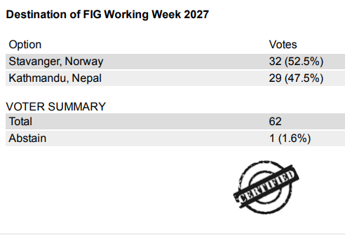 FIG President Diane Dumashie thanked both associations for their support to and interest in being the host of the FIG Working Week 2027 and for their engagement with FIG. The close result speaks for itself, however the General Assembly has decided that FIG will be welcoming all to Stavanger in Norway in 2027.