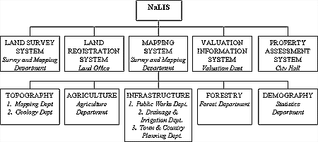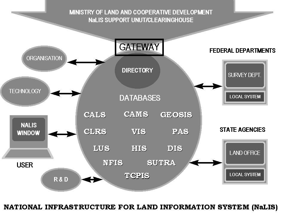 1. NaLIS is built on a platform of distributed databases making full use of IT, whereby data is kept in the databases of the land related agencies and not in one centralised system. The management of data is less cumbersome when it is done in smaller dedicated systems at the locations where the data is generated at the land related agencies. In this manner users of NaLIS need not keep all the data in their own systems but gets them from the various databases as and when they are required only. This approach is in line with the current technology that is emerging in the development of information systems as stated in the report of the United Nations Ad Hoc Group of Experts on Cadastral Surveying and Land Information Systems which states that;