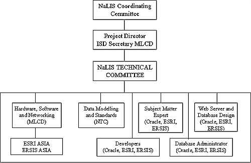 3.3 The organisation for the development of the NaLIS Prototype involves the Ministry of Land and Cooperative Development (MLCD), the NaLIS Technical Committee (NTC), Oracle Systems Malaysia, ESRI South Asia, ERSIS Asia, Digital Equipment Malaysia and other vendors shown in Figure 5.
