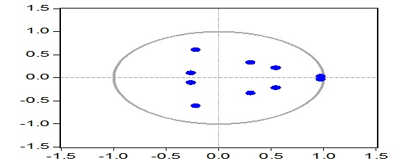 *indicates lag order selection by criterion. Where LR denotes: sequential modified LR test statistic (each test at 5%level); FPE: Final prediction error; AIC: Akaike information criterion; SC: Schwarz information criterion and HQ: Hannan-Quinn information criterion. While LogL is thelog likelihood function. Analysis of this magnitude presumes the presence of stationary within the data series(Brooks, 2008).The examination of the inverse roots of the autoregressive polynomial (fig.2)however reveals that the absence of non- stationary in all VAR variables, since none of the roots has a modulus greater than one and none lies outside the unit circle.