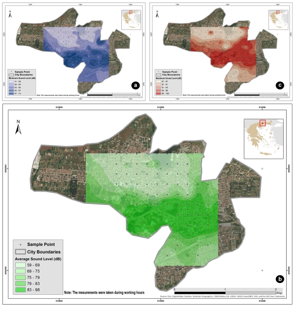 Upon completion of the field survey, the recordings were mapped using QGIS and ArcGIS software. Different software was used to produce maps in each city, as the cities were studied through different research programs. The maps produced included variables according to: (a) the average value of the recorded noise levels; (b) the minimum values; and (c) the peak values for working hours.