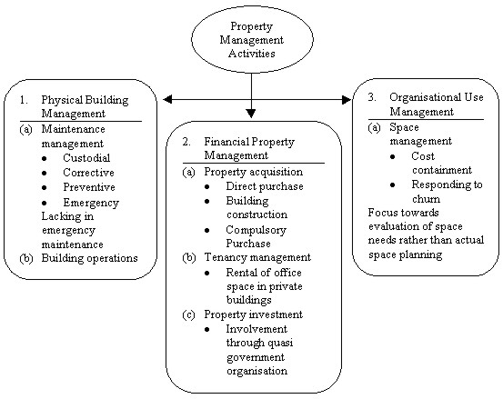 Property assets such as land and buildings are a key resource for all types of organisations, including public sectors. For the last two decades positive effects of good property management have received increased attention as the stock of new buildings costing billions of ringgit are being put into operation. In private sector, this attention is due largely to the recognition of the significant contribution property makes to ultimate success or failure of a business and recognition of strategic importance of property to a company's financial structure. While within public sector organisations property can be considered as having financial contribution and effect upon annual financial statements, asset base and as well as on resale values in case of privatisations of any public entities. Therefore property resource, in the same way as human, financial and information resources, contribute to the success of these organisations and need to be effectively and efficiently managed. These property assets have to be professionally managed to ensure that the asset value is maintained. It is acknowledged that not only is a large amount of capital devoted to these property assets, they can also add value to an organisation through effective and often creative management.