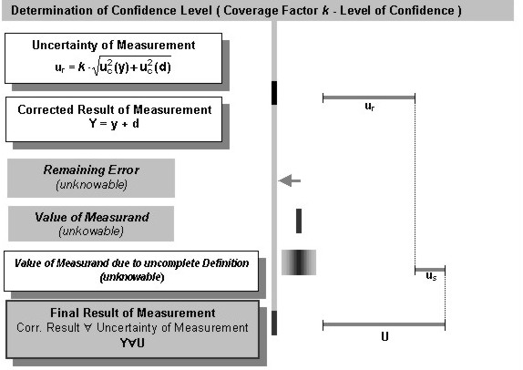 where j indicates the number of determinations for the output estimate y. Its uncertainty is obtained by appropriately combining all u(xi) and is denoted uc(y) , the combined standard uncertainty of the estimate y, the result of measurement. In general this value is displayed, in our example as "measured distance", at the instrument. Unfortunately the process of evaluating y is mostly not known. It is therefore often difficult to determine the combined uncertainty with the desired reliability.